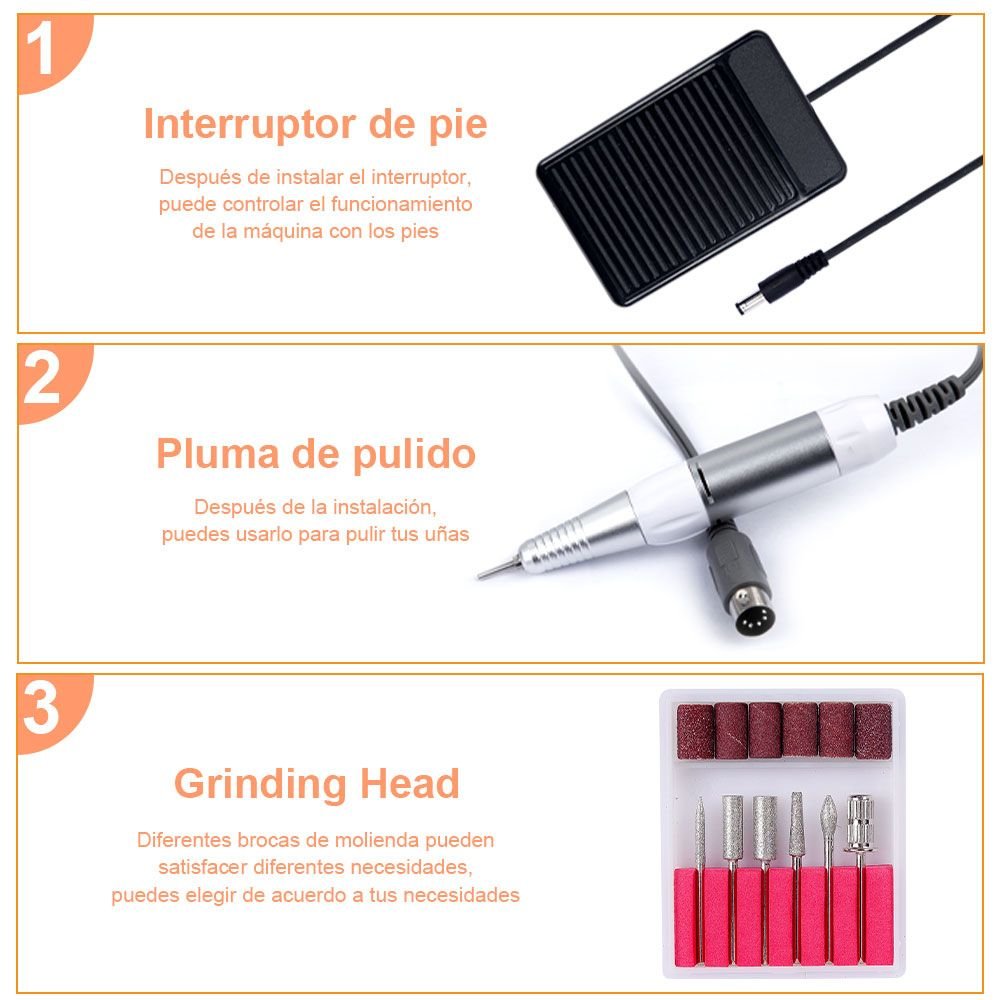 Adjustable Speed: 0 to 35; 000 RPM for different needs; generally you may use slow speed for the cuticle; medium for backfills and concave shapes; a fast speed for the shaping of the surface of the nail; easy to choose perfect speed with 1 control knob