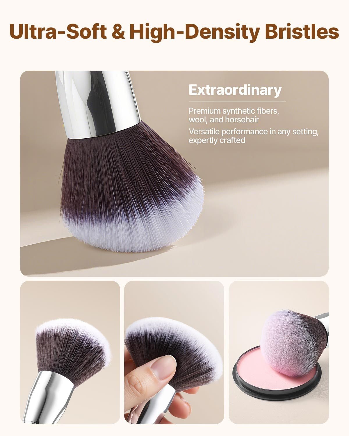 These foundation and eyeshadow blending brushes are perfect for both beginners and professionals. With excellent powder pickup, ultra-soft bristles, and buildable color payoff, each brush glides smoothly for seamless blending and a naturally radiant finish.